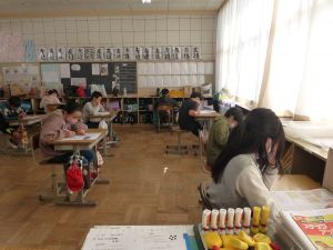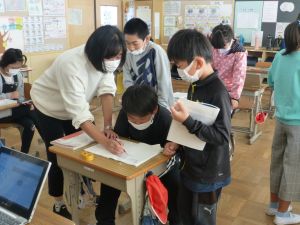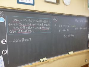 5年生の算数では「平均」の単元の学習を行っています。 今週,合計を個数で割ると平均が求められることを学習しました。つづいて昨日は,平均から逆に合計を求めることができることを学び,今日は一部の平均から全体のおおよその合計を求めることができることを学習しました。 個別での自力解決,友達への自分の考えの説明や話合い,タブレット・ロイロノートでの考えの共有など,様々な方法・手段で学習が進められました。今日は練習問題をみんなが解くことができ,授業のまとめには子どもたちから出た言葉が十分に生かされていました。