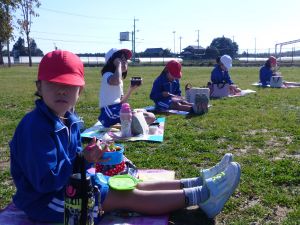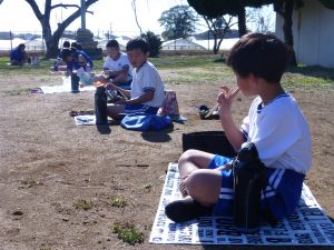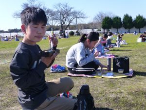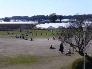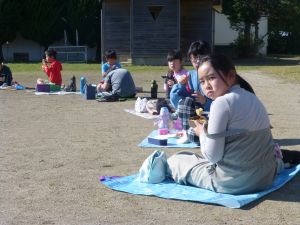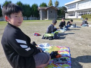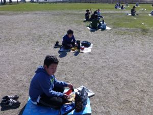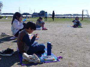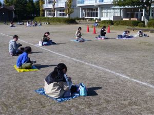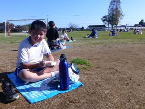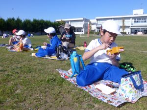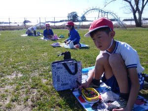 丸っこいハート型の葉っぱと,細長いとげとげした葉っぱが目立ちます。 何の種類の野菜だったか,たしか3種類の種をまいたはずです。 そろそろ細かな草を抜いたり,間引きをしようかなと思っています。 今日はお弁当の日。外は好天に恵まれ,ポカポカとあたたかな日です。 4時間目を終えた児童は,お弁当とレジャーシートを片手に,校庭に出てきました。 校庭での楽しいお弁当タイムです。子どもたちの表情を見ていると,お家の人に作ってもらうお弁当が大好きなことが一目瞭然です。 保護者の皆様,お忙しい中,本日もおいしいお弁当をありがとうございました。