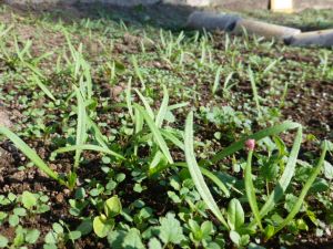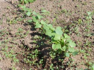 無数の葉っぱが畑いっぱいに広がっています。 芽が出たのかな,それとも雑草かな。
