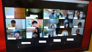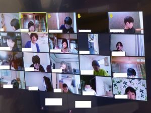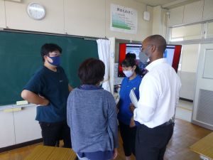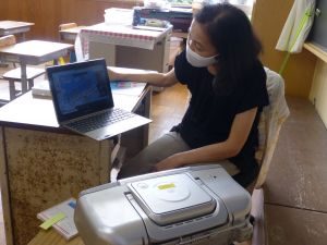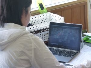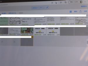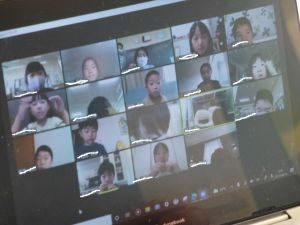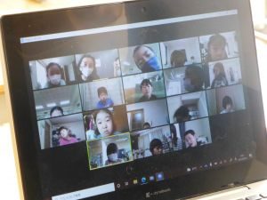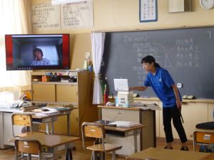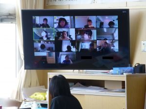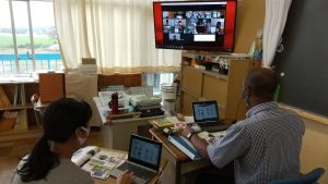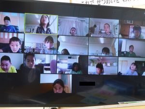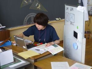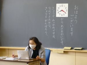 5年生は国語です。画面が「地方紙」「全国紙」という文字が見えます。新聞の話題でしょうか。それぞれの特徴や良さについて考えているのでしょうか。担任のイヤホン越しに,児童が問いに答える声が聞こえてきます。