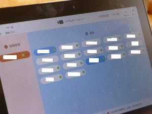 1年生はジャストスマイルドリルに取り組んでいるところです。この画面は「リアルタイムビュー」と言って,担任は児童の問題が進むスピードや正答率をリアルタイムで把握することができます。タブレットの向こうにいる担任の先生ですが,こうしてみんなの学習状況を確認していますので,1年生は是非油断なく学習を進めてくださいね。