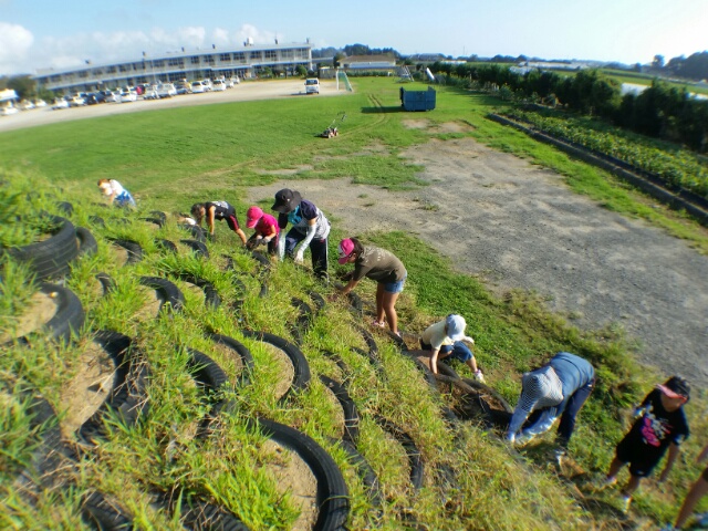 子供たちは、チャイルドマウンテンのタイヤに生えた草とり。登りながら草をとる女子組と、頂上から下りながら草をとる男子組。どちらがいいのかは、難しいもころです。(*_*)