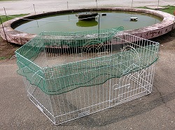 ほら、もうカメ君は 「なんだなんだ、美味そうなにおいがするぞ。食べたいなあ」と寄ってきていました。ネットを張らないと、サークルの隙間から首を突っ込んで食べてしまう恐れがあったので、ネットを取り付けたのですね。下の方から首を突っ込んでもホテイアオイは食べることができませんので、上の部分だけネットをつけました。