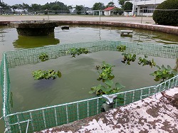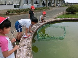 学校の池に水生植物の「ホテイアオイ」を入れました。植物がなくて味気ない池でしたし、水生植物が育つことで濁った池を何とかできるのではないか、という期待を込めているのです。