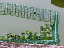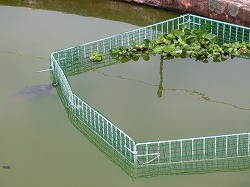 ネットを上部につけたサークルを池に入れて、ホテイアオイを浮かべました。そして、しばらくして見に行くと、