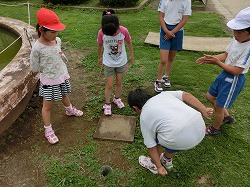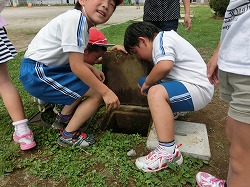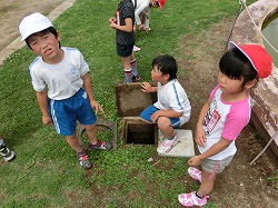 休み時間、池のそばの排水ますを子ども達がのぞき込んでいます。板だけがかぶせてあったので、「これは危ないなあ」と、教頭先生がコンクリート製のふたを購入して、きちんとかぶせていたのに、わざわざ開けているのです。