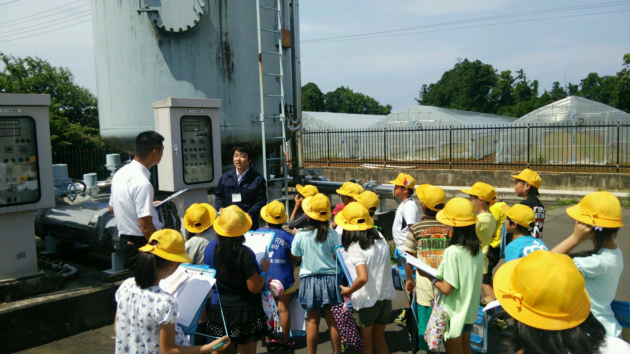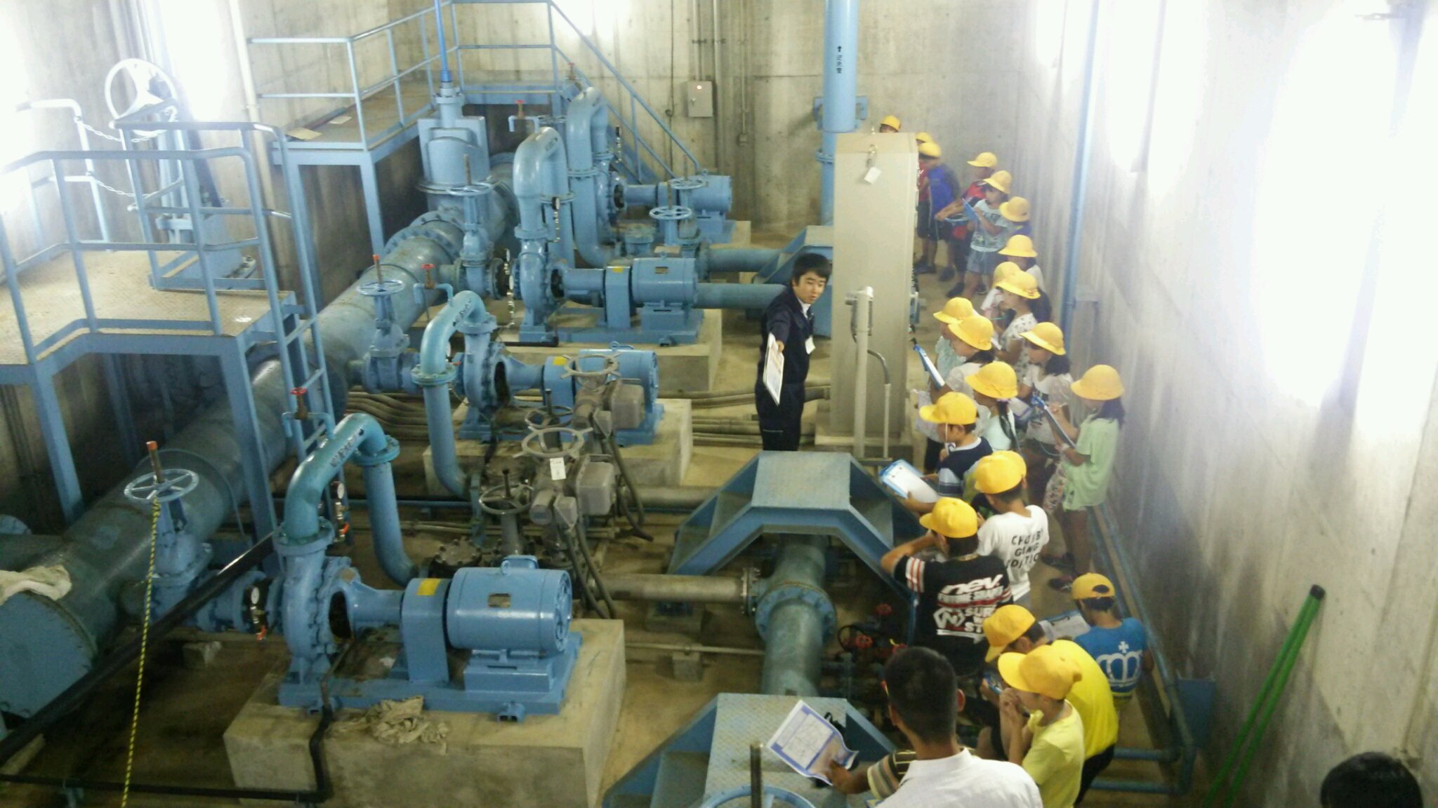 子ども達は、いくつも並んだポンプにびっくり。いくつもあるのは、そのうちの1つが故障しても水を送り出す機能は大丈夫なようにということです。メモを取りながらしっかり学習しています。このポンプで圧力をかけて水を送り出しているのですね。地下水がポンプや水道管の中を巡っているので、外は暑くてもこの中は快適に涼しいのでしょう。