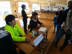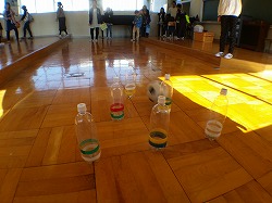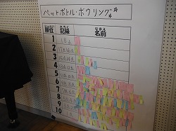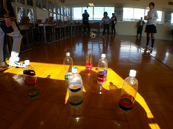 音楽室の階段状の床を使って,ボーリング。倒すのはペットボトルのピン。これが,はじけ飛ぶとキャップの部分が当たって反響する音が,ほんもののボーリングのように聞こえるから不思議。6本のピンを3回チャレンジできます。最高得点者は18点で1名います。(^o^)丿 やりますね。