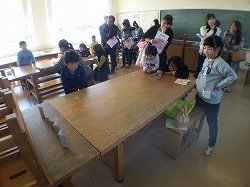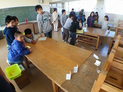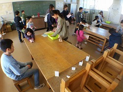 大きな的は10点,小さな的は50点……と,5本の輪ゴムを使ってすべて倒せば「100点!」というゲーム。ちなみに,ゴム鉄砲は「100均」のものですが,なかなか夢中になれるゲームですね。(‘◇’)ゞ