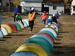 ▼雲梯とタイヤ跳び。高学年生は,雲梯が低めなのでぶら下がると足がついてしまいますけど。