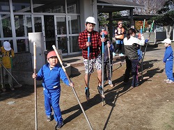 ▼鉄棒ではいろいろな技にチャレンジ。竹馬はなれてくると,すこし高めにして乗りますね。