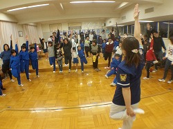 ▲片手を挙げて,片足立ち。これでバランスよく立っていられない方の骨盤に問題があるそうです。腰や肩など全身を動かす運動もダンスで楽しく行いました。