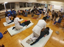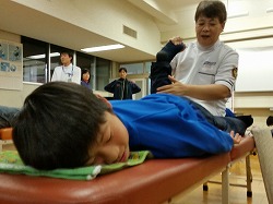 ▲マット上で体全体の「ゆがみ」を診ていただきました。「背中から肩が鉄板のように堅くなっていますね」と指摘される保護者も。子どもでも,筋肉の付きが足りないと言われる子もいました。筋肉の基本は小学生のうちに作らないと,中学生以上になってからでは作れないのだそうです。