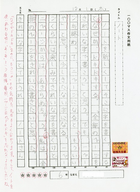 6年生のA.Sさんの「100マス作文」校長賞です。「ノート」というとても日常的なところに目をつけて題材にしています。