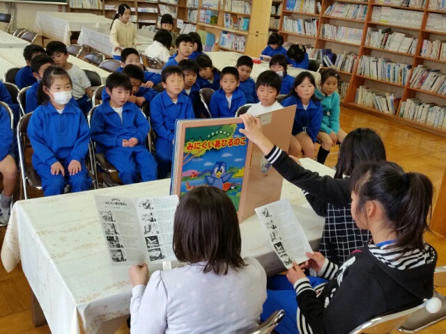 今日のお昼休みに、図書委員会の児童が読み聞かせを行いました。 1.2年生があつまり、大型絵本の「みにくいあひるのこ」に真剣に見入っていました。 |