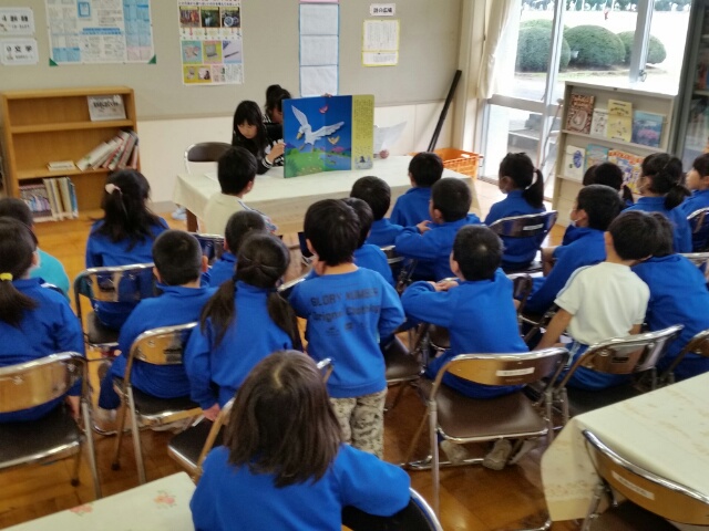 1.2年生があつまり、大型絵本の「みにくいあひるのこ」に真剣に見入っていました。