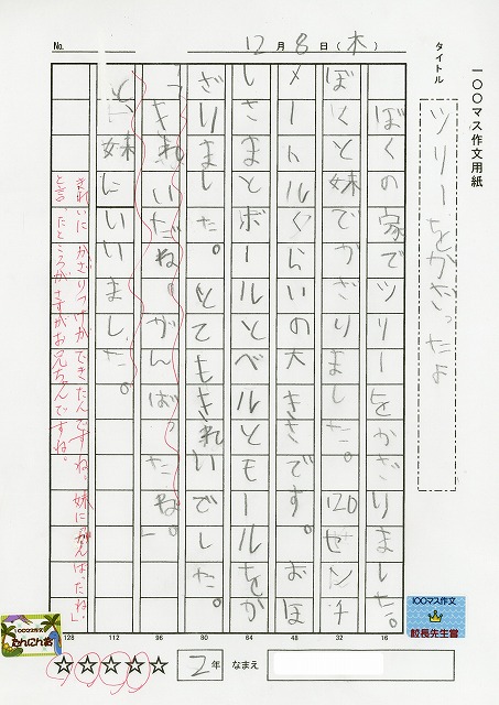 12月に入り,クリスマスツリーを家庭で飾った子もいるようです。今回はそんな体験を100マス作文にした2年生のK.Kさんの作品です。