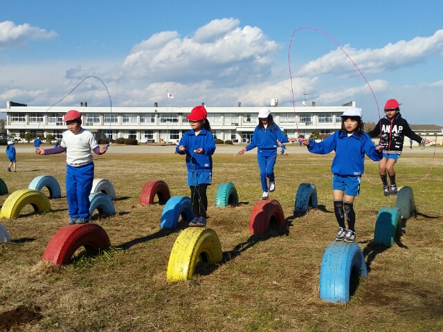3月期はなわとび大会もあるので、休み時間はなわとびをやる子が多いようです。こちらは、タイヤの上でなわとびをする子たち。(^o^)/~~ なわとびが上手な子でも、ちょっと苦戦します。でも、しっかりと二重跳びをする子もいます。やりますね。\(^o^)/