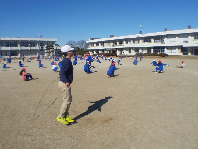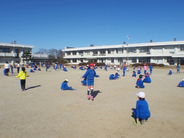 今日、金曜日の中休みはなわとびタイムです。連続とびがどれだけ続けられるか。続けられると、それぞれのポイントになります。風もなく、あたたかな校庭で、子供たち、がんばっています。\(^o^)/