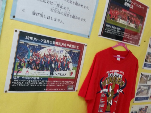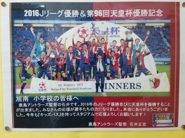 2016年のJリーグ戦,天皇杯の優勝を勝ち取り,さらにクラブワールドカップ戦ではレアル・マドリードと堂々と世界一をめざして戦った鹿島アントラーズ。国内最高の19冠に輝きました。ホームタウンとしての鉾田市の学校に,鹿島アントラーズから記念ボールが寄贈されました。また写真入りのメッセージ(石井監督から)も届きました。(^o^)丿