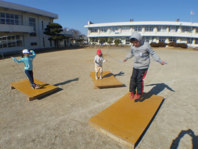 子供たちがジャンプ板を使ってなわとびをしています。特に二重とびを覚えるときにジャンプを助けてくれますので、有効です。このジャンプ板で感覚をつかむと、平地でも二重とびができるようになります。