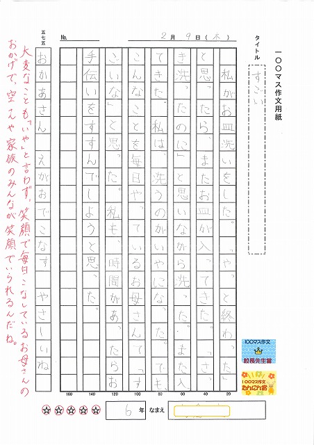 6年生のA.Sさんの100マス作文です。タイトルは「すごい」。何がすごいのか,気になる作文です。(#^^#)