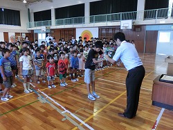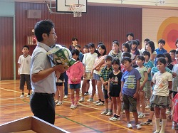 諏訪郵便局に飾られていた「ワールドカップ」仕様のサッカーボールを、今朝の朝会時に局長さんが「子供たちで使って下さい」と寄贈してくださいました。児童会長のT.Rさんが受け取り、感謝のことばを述べました。