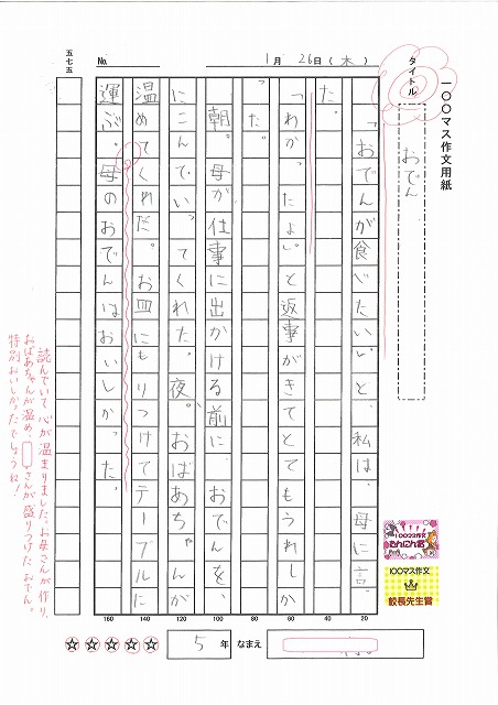 100マス作文:校長先生賞「おでん」。5年生のK.Rさんの作品です。