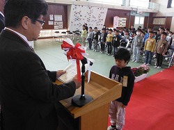 ▼続いて,修了式。修了証は代表の児童に手渡されました。学年全員がしっかりと起立して臨めました。