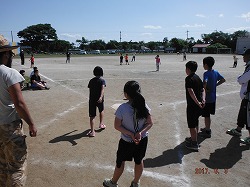 近所の仲間たちと楽しそうですね。大人も交じって試合形式の練習では、お父さんお母さんも童心にかえってがんばってます。今日の夕飯は美味しいんだろうな!