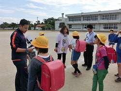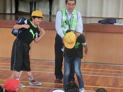 その前に、「不審者侵入時の避難訓練」を行いました。不審者役は、スクールサポーターのKさん。元県警機動隊で剣道の高段者。迫力ありましたが、教頭のT先生とS先生が不審者を興奮させないように上手に対応していました。児童たちは不審者を確認すると自分たちで考えて校舎内に逃げました。高学年が低学年の面倒を見て、短時間で全員避難することができました。