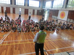 その後、体育館に移動して「防犯教室」を行いました。登下校中や一人で留守番をしているときに気を付けることについてお話を聞きました。
