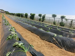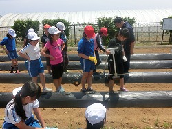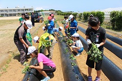 今日(6/15)は、4年生がイモ苗植えを行いました。講師は保護者のSさんです。ご夫婦で参加してくださいました。まずはマルチに穴をあけました。説明を聞いた後、専用の器具を使い交代で行いました。次は、いよいよイモ苗植えです。ツルを刈るときのことを考えて、列ごとに向きをそろえて植えました。なるほどと思うことが多くあり、農家の方の工夫を聞いて勉強になりました。秋の収穫がとても楽しみになってきました。