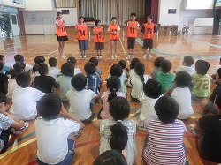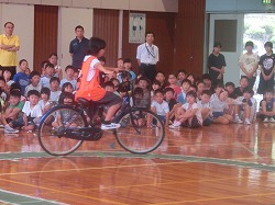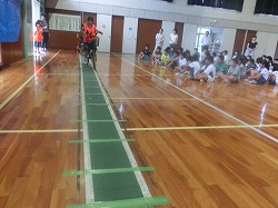 7月4日の全校朝会で、6年生の6名がこれまでの練習の成果を発表しました。細い道やS時をバランスを保って走ったり、1m間隔のピンの間を通り抜けたりすると子供たちから拍手が沸き起こりました。人前で演技するのは初めてでとても緊張したようですが、今日の本番に向けて良い予行練習になったことでしょう。頑張れ選手たち、学校そして鉾田の代表として!