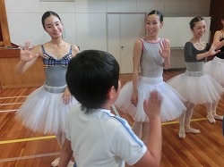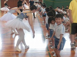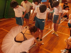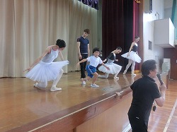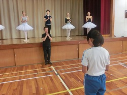 バレエについての説明を聞いた後、基本姿勢をみんなで練習しました。丁寧に教えていただきましたが、つま先を開いて立つのは、難しかったようです。上手にお辞儀ができた1年生のS.Mさんはステージに上がって見本となりました。最後に児童会長のK.Kさんが感想とお礼の言葉を述べました。