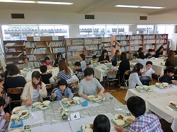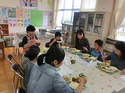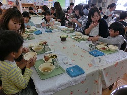 まずは親子で給食の会食です。今日はお月見メニューでした。ウサギ型のハンバーグが初めて出ました。みんなどこから食べたかな?