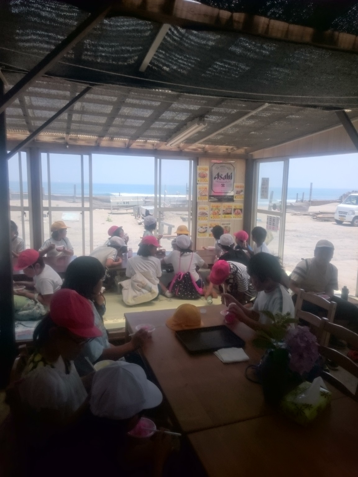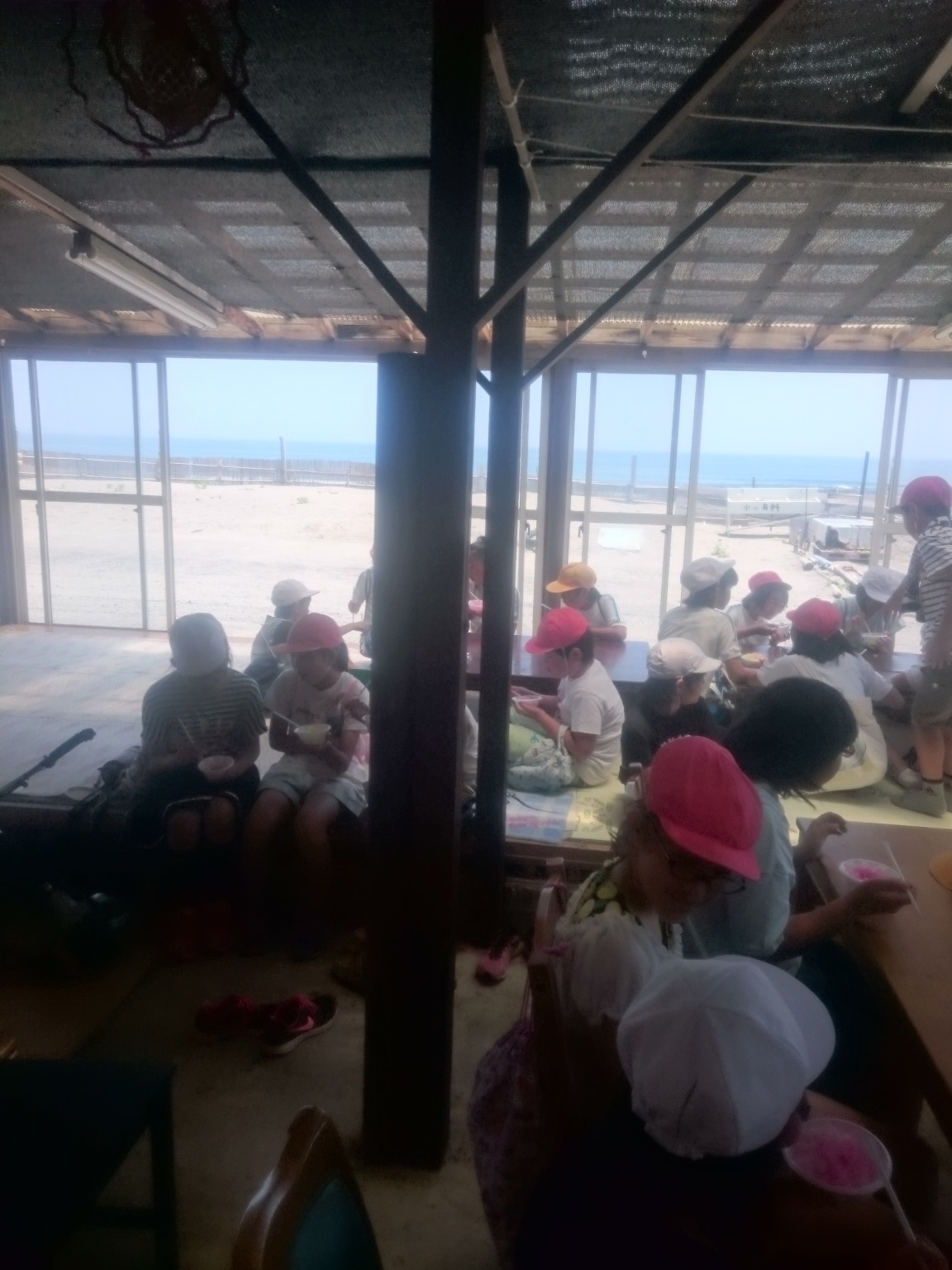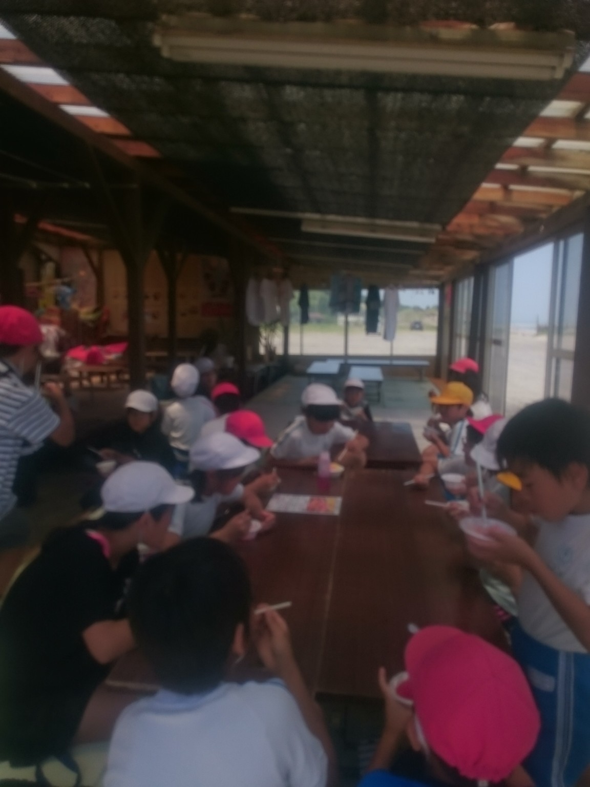 なんと!滝浜海岸の滝浜売店の方が、かき氷を1人1つずつ用意してくださったのです(*^.^*)汗だくになってガンバった子供たちに思いがけないプレゼントでした!ただ、時間にちょっと余裕がなかったもので、急いで食べて頭が痛くなったり口の中が冷たくなりすぎたりした子もいたようです(^^;一生懸命食べてるので、笑顔の写真がなくてゴメンナサイ~(>_<)