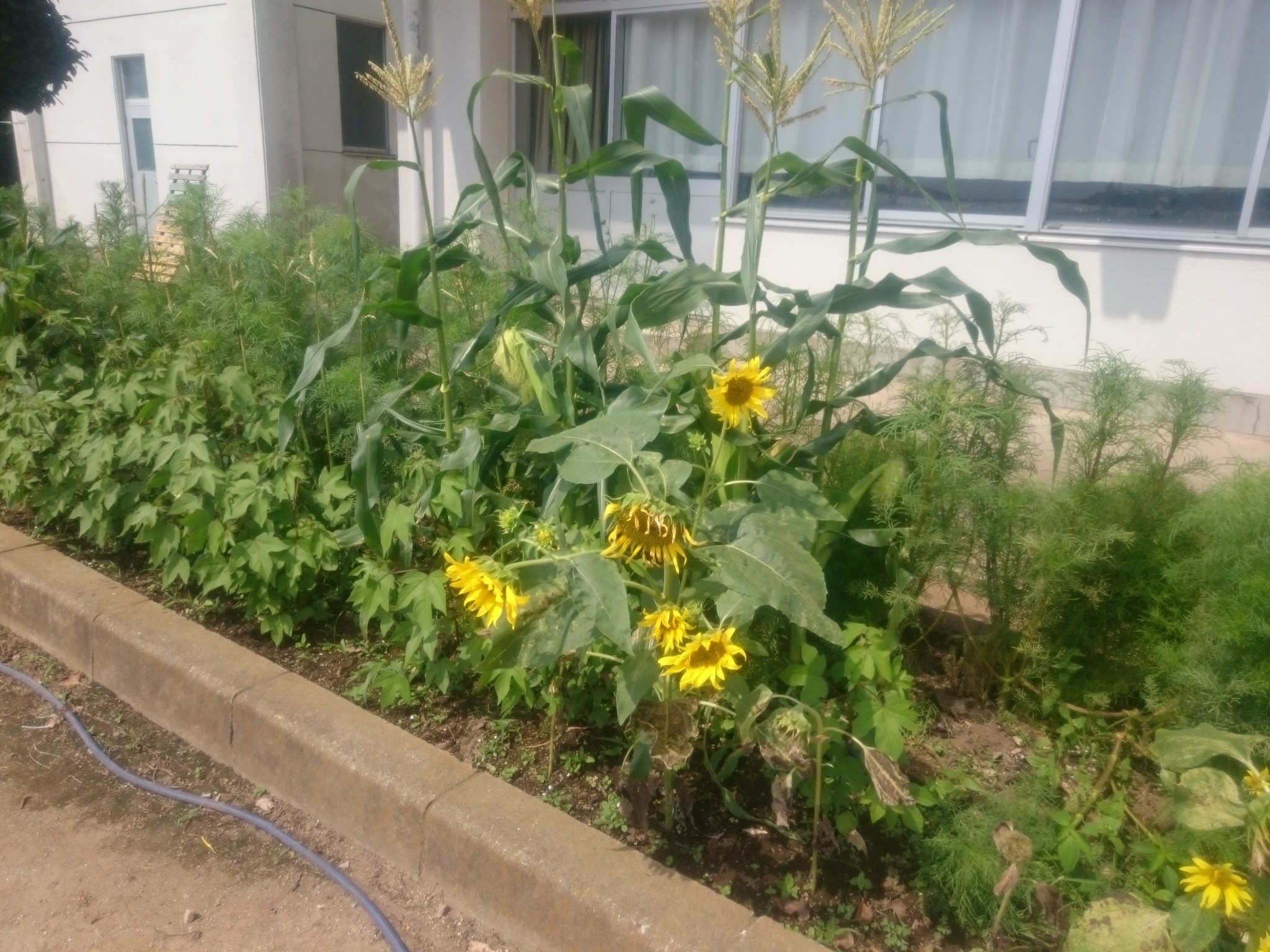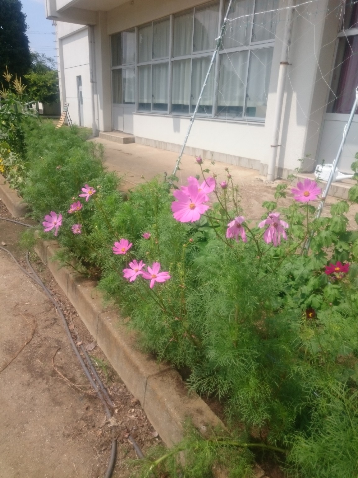 毎日毎日暑くて、外に出るのも嫌になる(というか危険!)な日々が続きますが…本校の花だんは、園芸王子S先生主導のもと、色々な植物が元気に育ちにぎやかです(^-^)先日、ひまわりの種まき集会を行いましたが、こちらのひまわりは、昨年こぼれた種から咲いたその名も「勝手にひまわりプロジェクト」(^○^)