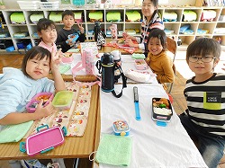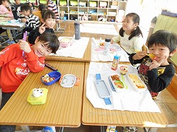 「家族で一緒に弁当を作る日」でした。1年生の教室におじゃまして一緒に食べました(T)。みんなこの時間を楽しみに待ってました。1年生は、自分のお弁当のおかずを解説しながら食べていました。中には、「このサンドイッチ私が作ったの」という子も。みんな笑顔で食べていました。「毎日、お弁当がいいな」ですって。「だよね」とは言っておきましたが・・・。なんと全員 完食です。「ごちそうさまでした。」