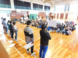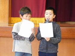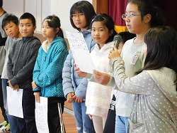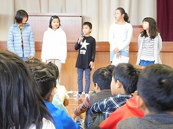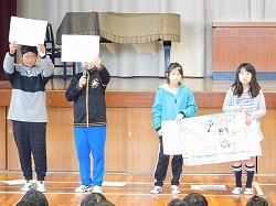 11月20日に行った、児童朝会でのJRC委員会の発表です。今回は、「赤い羽根共同募金」について、その集まったお金の使い道などを説明して募金をみんなに呼びかけました。その後は、クイズです。Q1 なぜ、羽の色が赤いのでしょうか? 答えは、赤は「勇気と善い行い」のシンボルだから! Q2 昨年旭南小で集まったお金は、合計でいくら? 答えは、2万3千円。