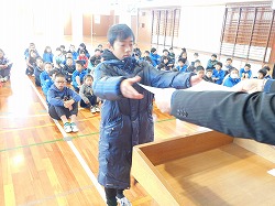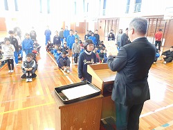 児童朝会を行いました。朝会に先立ち、表彰を行いました。まず、鉾田市文化祭に出品した児童の表彰を行いました。次に「家族の絆作文」で入賞した6年生のN.Hさんの表彰がありました。N.Hさんは、亡くなったひいおばあちゃんとの楽しかった思い出を書きました。心温まる文章で、1次・2次審査を通過し最終審査を経て入選したのも納得する作品です。N.Hさんの思いはきっと天国のひいおばあちゃんにも届くはずです。