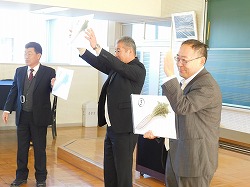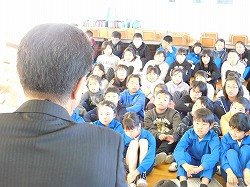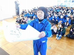 18日の全校朝会です。まず、表彰を行いました。「みんなに進めたい一冊の本」推進事業、4年生から300冊の本を読んだ児童に県知事賞が贈られます。6年生のI.Sさんが達成しました。「おめでとうございます」 続いて1年間に50冊を読んだ児童の表彰です。受賞者17名を代表して6年生のN.Sさんが賞状を受け取りました。「おめでとうございました」