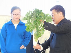 「大根の根っこは、どこでしょう?」三択問題です。正解は、児童の予想が最も少なかったものでした。児童会長のN.Iさんが、校長先生が作った大根で確認しました。「わっ本当だ!」 大人でも知らない人は多いと思います。お子さんに聞いてみてください。