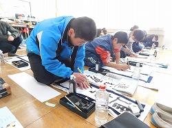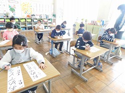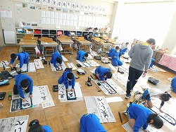 今日は「書初め会」 みんな真剣に書いてました。上手な字を書こうとするときは、無口になるものです。どの教室もとっても静かでした。思った通りの字が書けたかな? 休んでいる児童もいますので、審査は来週行います。