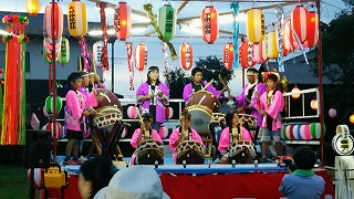 太鼓を叩くのは、樅山地区の子供たちです。地区のベテランの皆さんからの指導を受けて、練習に練習を重ねて「祭り」の舞台での披露となりました。振動がずしりと来る大太鼓と軽快な小太鼓の見事なばちさばきです。