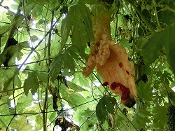 これは、ツルレイシ(ゴーヤ)の実から落ちた種でした。緑色の実のうちは、野菜っていうかんじですが、それが熟して黄色い実になり、やがてぱっくりと割れて「種」が見えると、これです! 真っ赤な種がねば~っと落ちてきます。T.Bさんが「気持ち悪~い」と言うのも分かりますね。