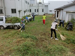 朝7時から、PTAによる奉仕作業で草刈りが行われました。草払い機による草刈りと同時に、熊手で草を集め、さらに同時にダンプや軽トラックで草を処分に運ぶという連携の活動です。テキパキと作業をすすめる保護者のみなさんです。(^o^)