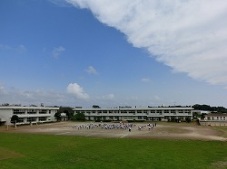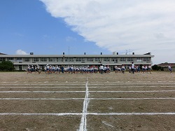 空は青空、校庭には刈り詰められた草地の緑。とても清々しい1校時の全体練習風景です。運動会で使うトラック部分には、白いラインも引かれています。「準備運動ができる体形に、開け!!」 子供たちが走ります。いよいよ、運動会という雰囲気が盛り上がってきました!(^_-)