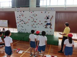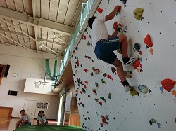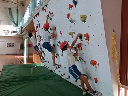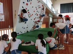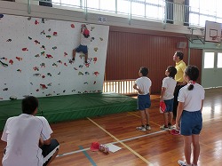▲4年生です。いい感じで登っています。確認者(2名)やその他の人たちも、「そこ、右手を上にして」「足、をもっと左」などと、アドバイスしながら応援しています。