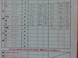 ▲手前の上級コースに何度もチャレンジしているのは、5年生のK.Rさんです。オールフリーならば登れても、コースが限定されると一気に難しくなります。 右の「クリアカード」は6年生のT.Rさんのものです。初級はあとで軽くクリアできるし、挑戦する人が多いので、「中級」からクリアしていきました。2日目で「中級」の12ルートをすべてクリアして、「上級」に挑んでいます。(^_^)v みんな、チャレンジ、がんばってね。